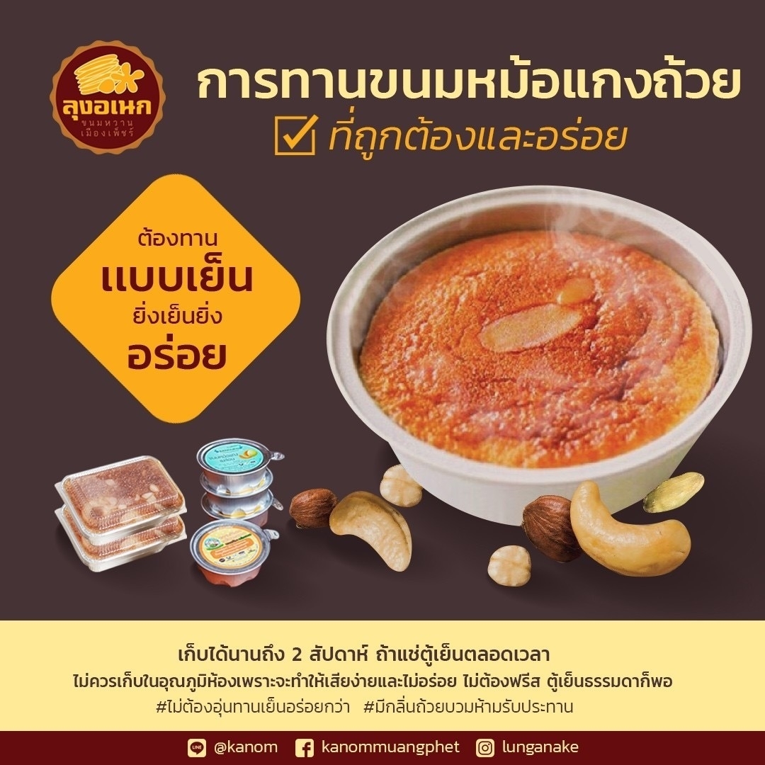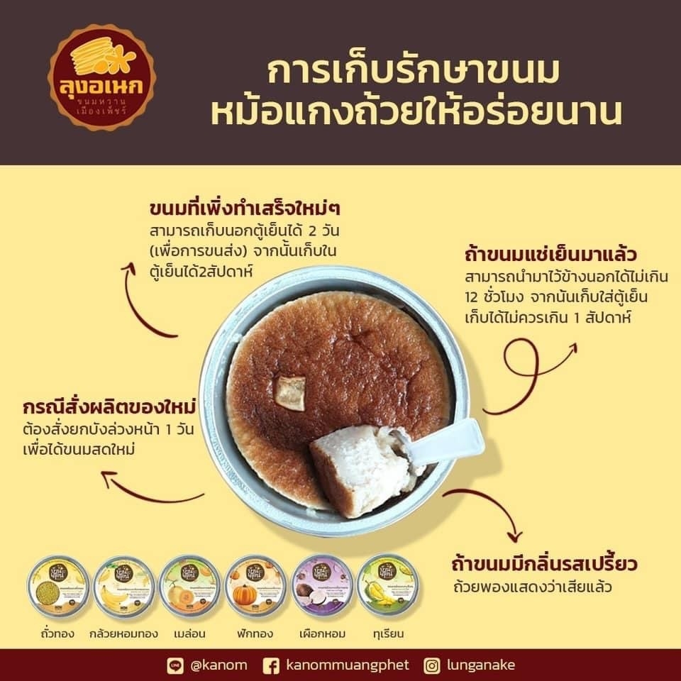 สำหรับขนมหม้อแกงกระปุก แนะนำทานเย็นจะอร่อยกว่า เก็บในตู้เย็นได้ 2 สัปดาห์ สามารถดูวันหมดอายุที่ข้างกระปุกเป็นสำคัญ